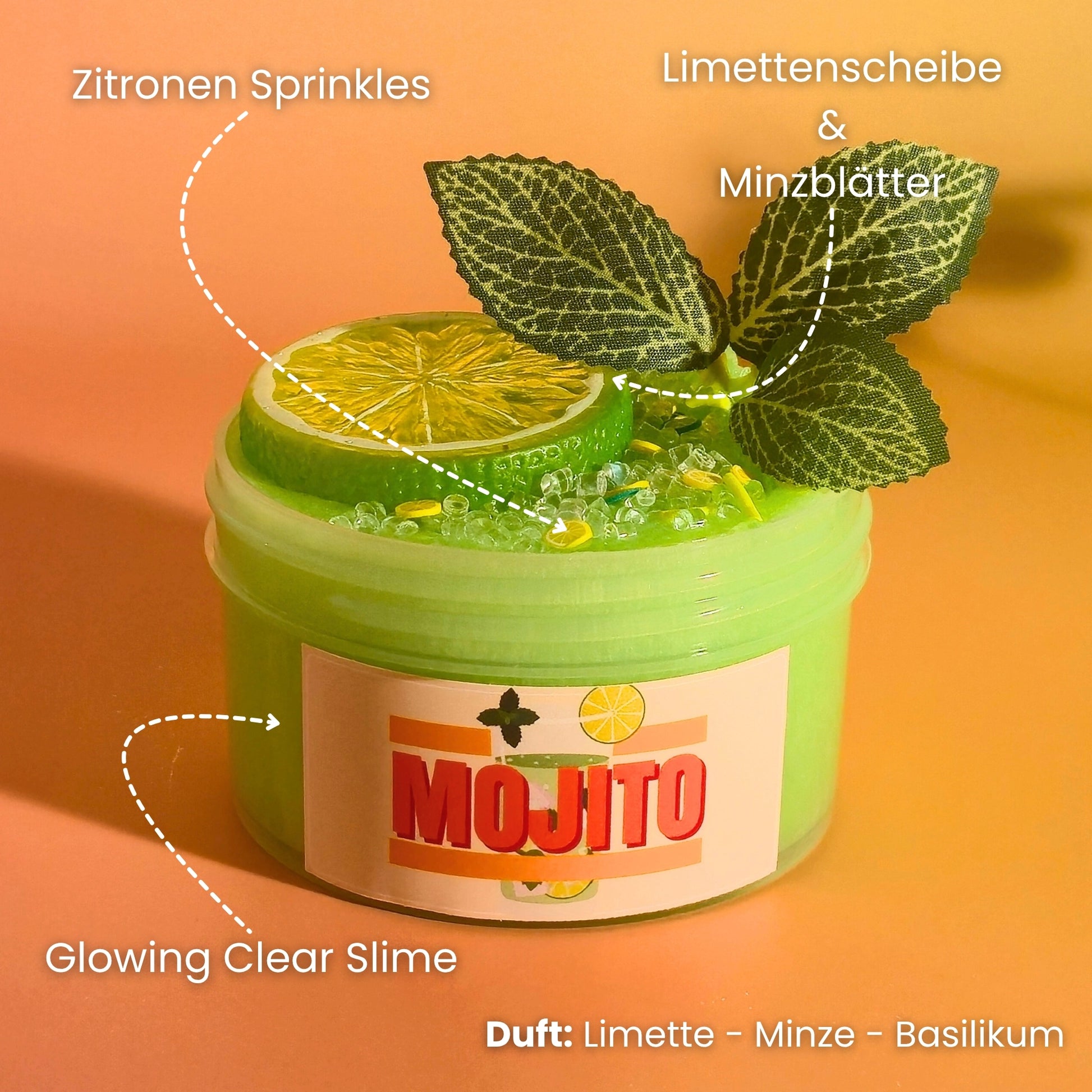 Wie ein eisgekühlter Cocktail an einem lauen Sommerabend: Mojito bringt dir das erfrischende Feeling von Minze und Limette direkt nach Hause. Der kristallklare Glowing Slime sieht nicht nur spektakulär aus – er fühlt sich auch so an!